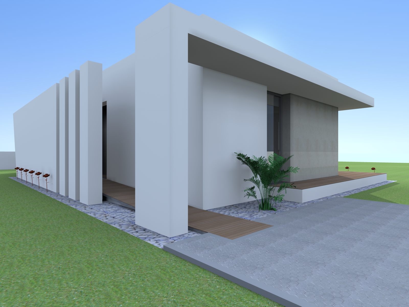 - Arranjos exteriores com jardins e muros perimetrais ou de contenção de terras e taludes;